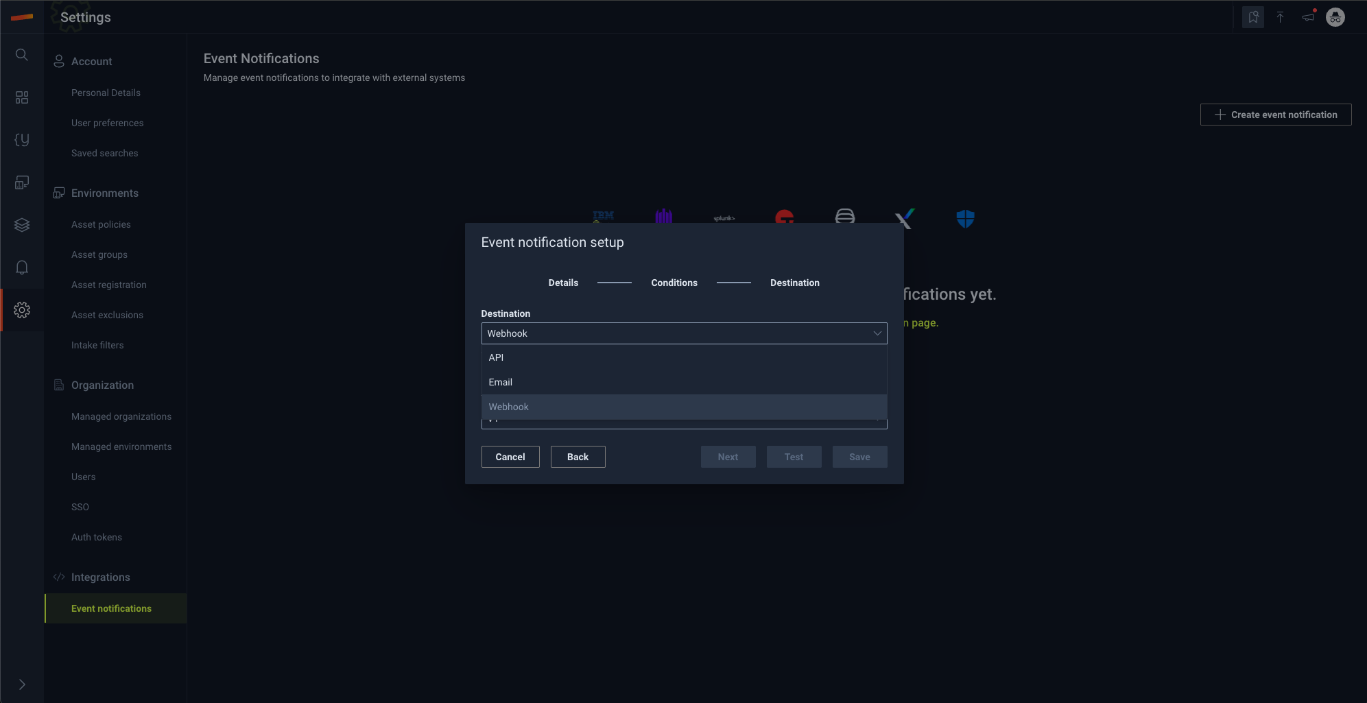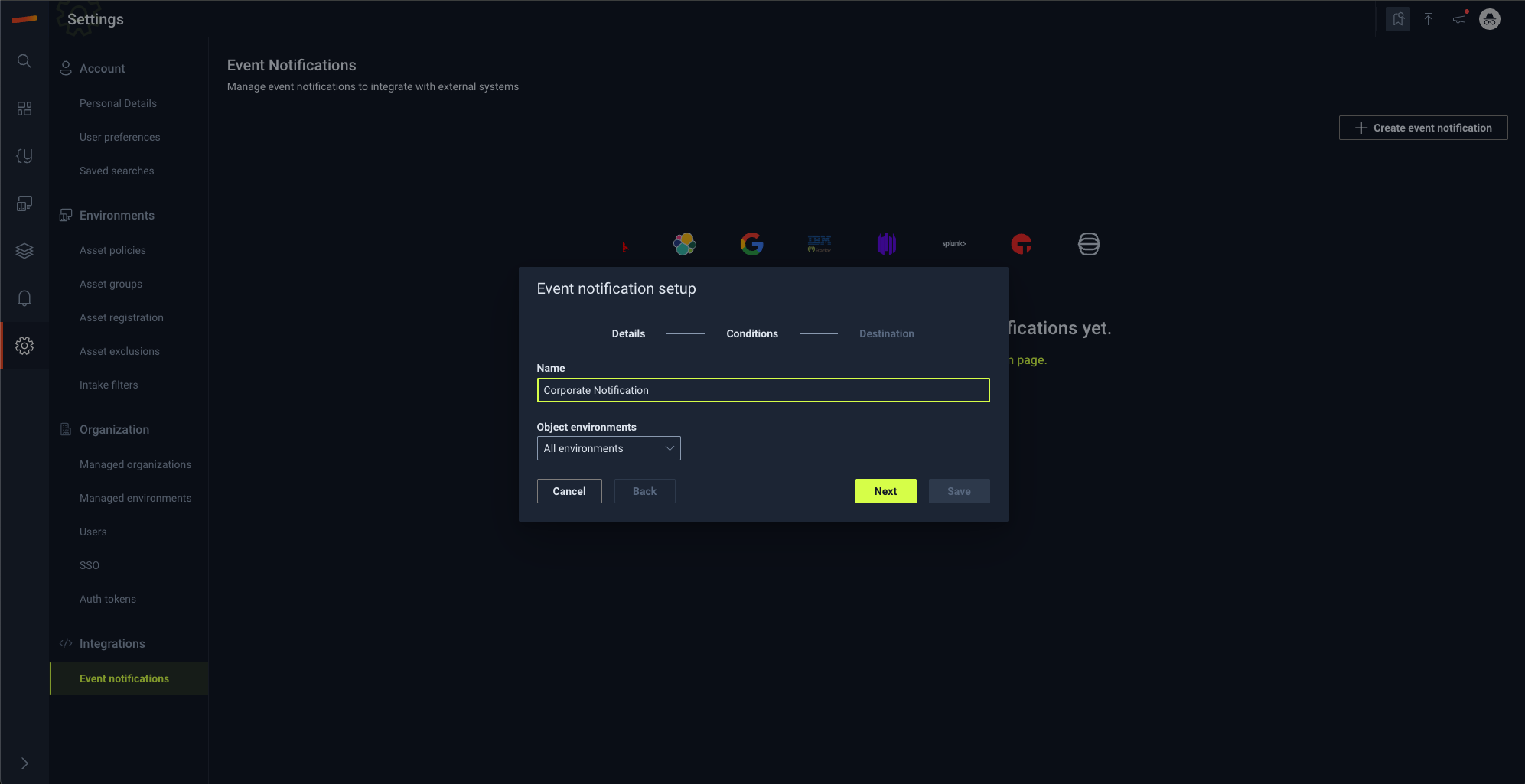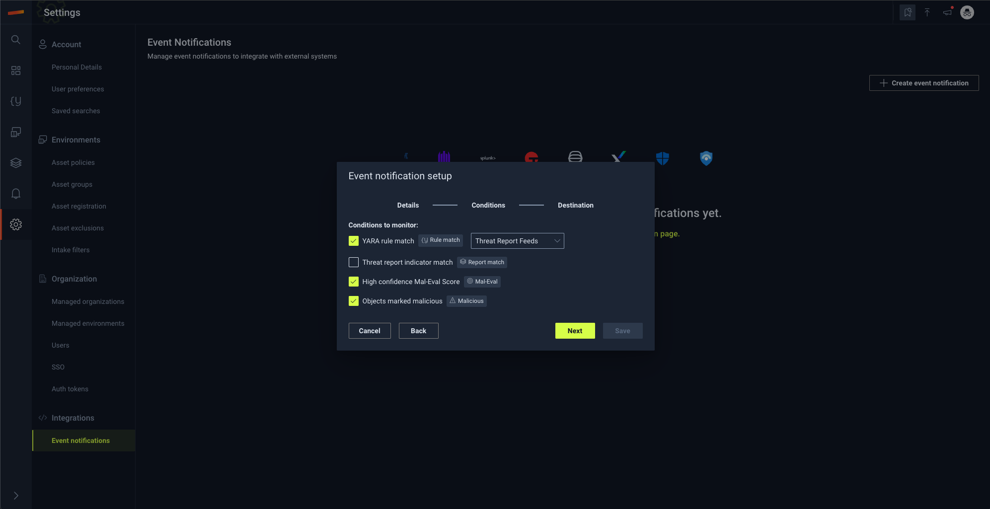 - YARA Rule Match will match any YARA rule in the environments selected on the conditions screen to any object in the environments selected on the details screen