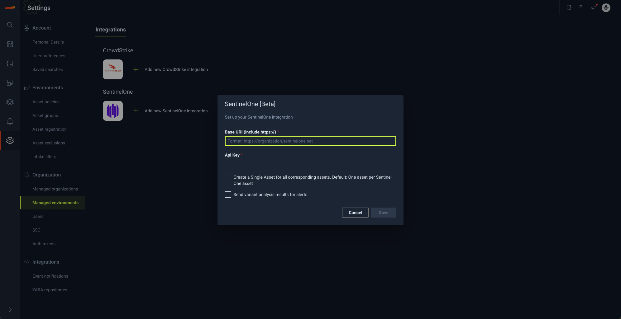 • S1 organization tenant (Ex. stairwell.sentinelone.com)