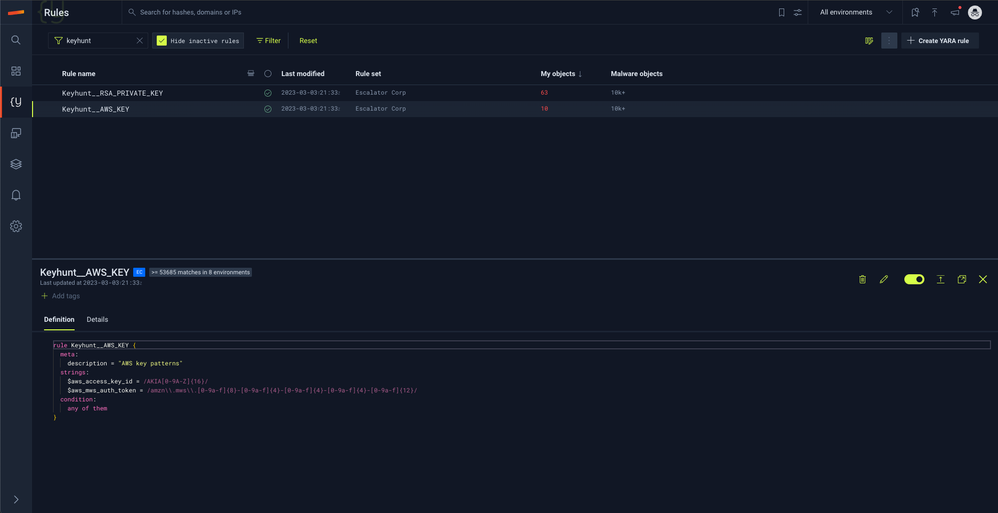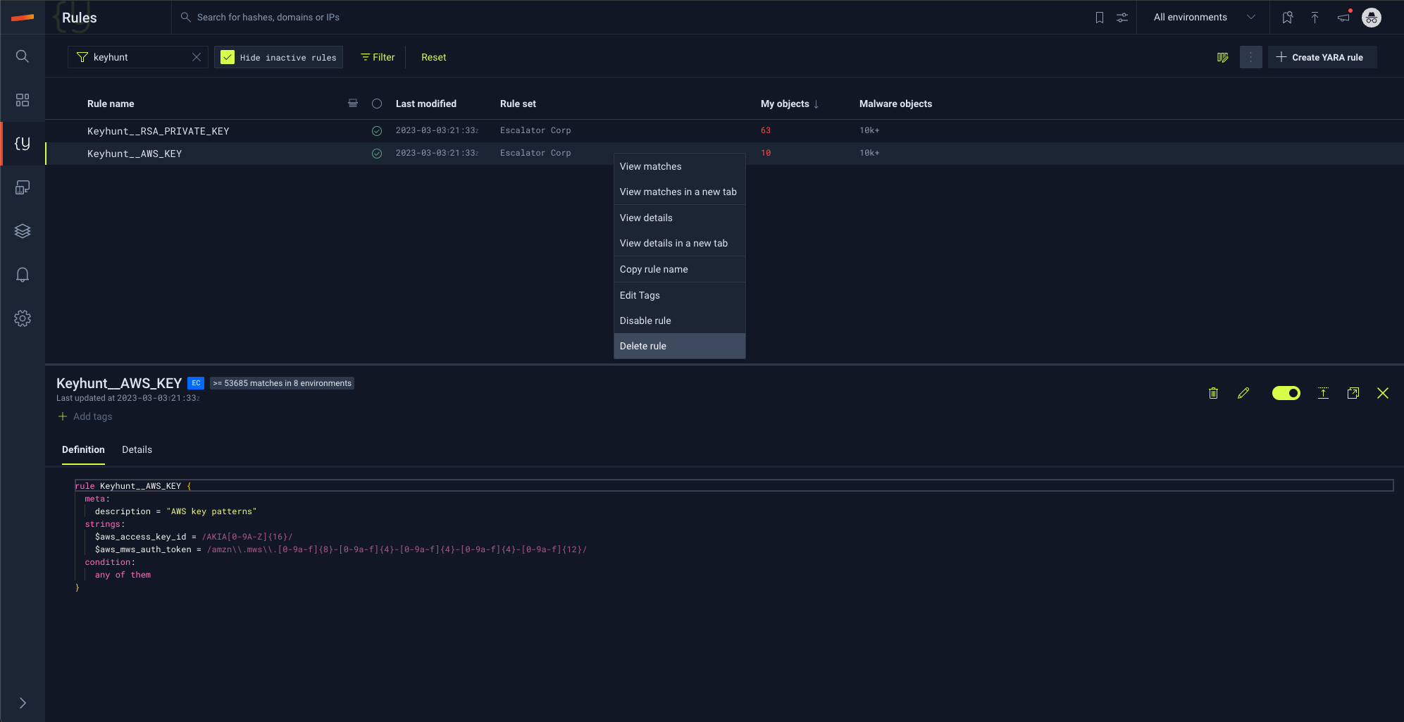 Deleting certain Yara rules can have a significant impact on detection capabilities but also can reduce alert noise for more broader rules that cast a wide net. Note that once a rule is deleted, it cannot be recovered. You may want to consider disabling a rule if you think you may want to preserve some of the rule logic for later.