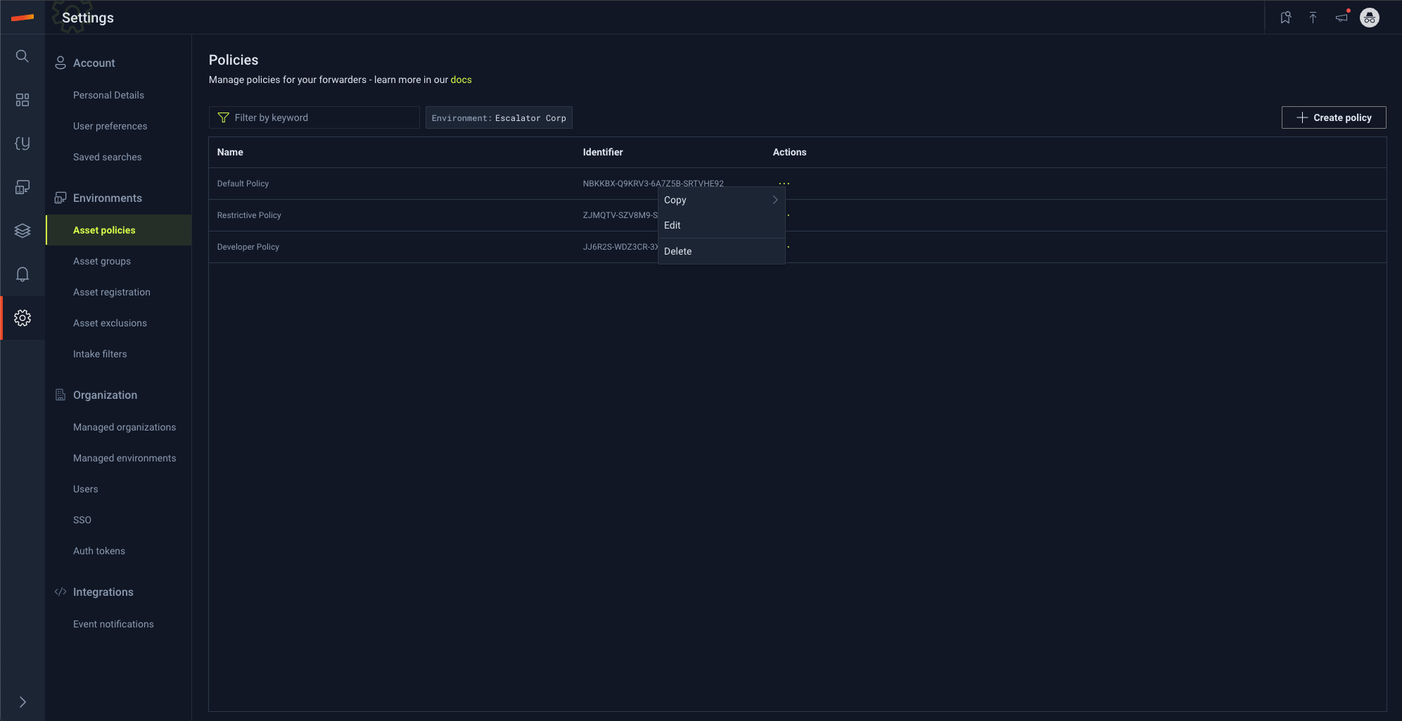 - Select the "Asset policies" tab under the "Environments" section