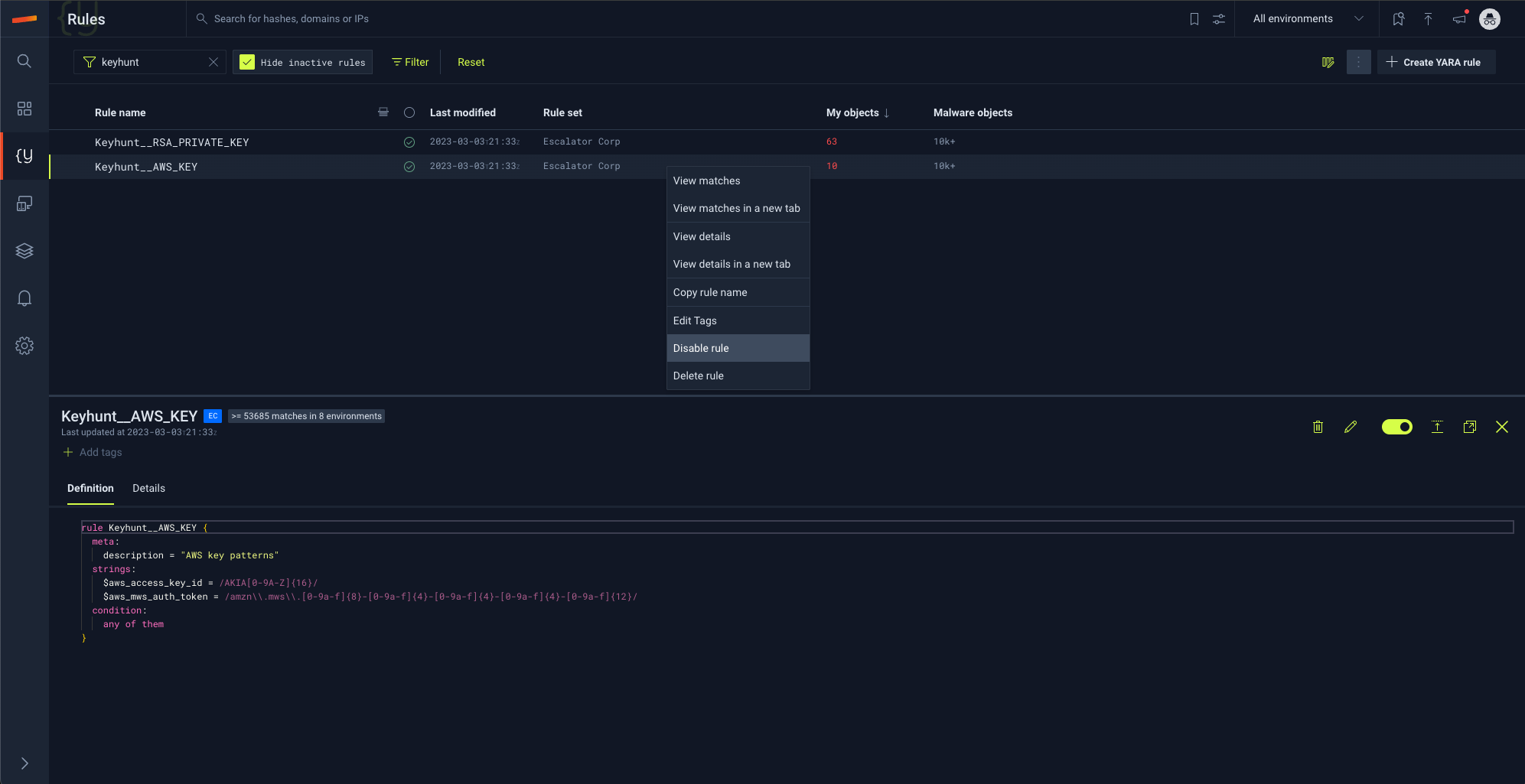 To enable or disable a rule, navigate to the Yara rules tab and select the rule you wish to make changes to:
