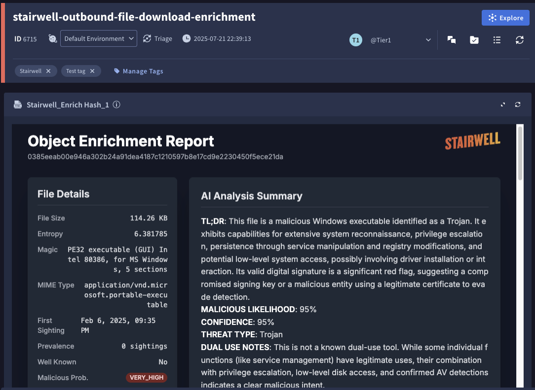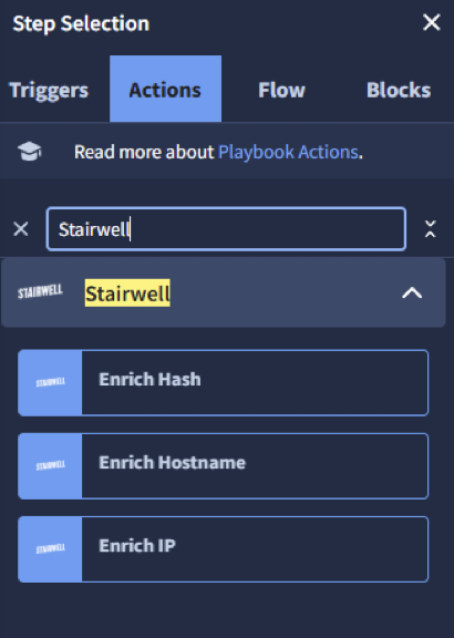 Enrichment actions are trigger-agnostic: whether cases are created from EDR alerts, SIEM correlations, or other playbooks, if they include a hash, IP, or hostname, Stairwell can enrich them.