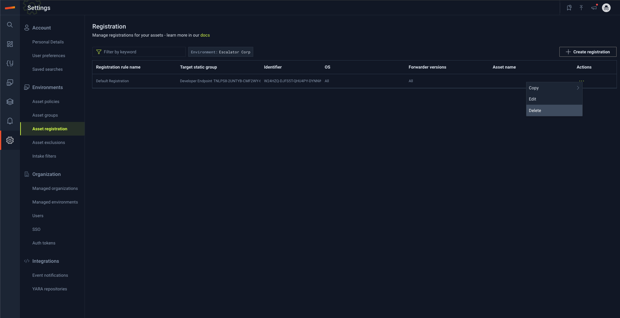 Select an environment in the environment drop down to specify which environment the registration should be created under