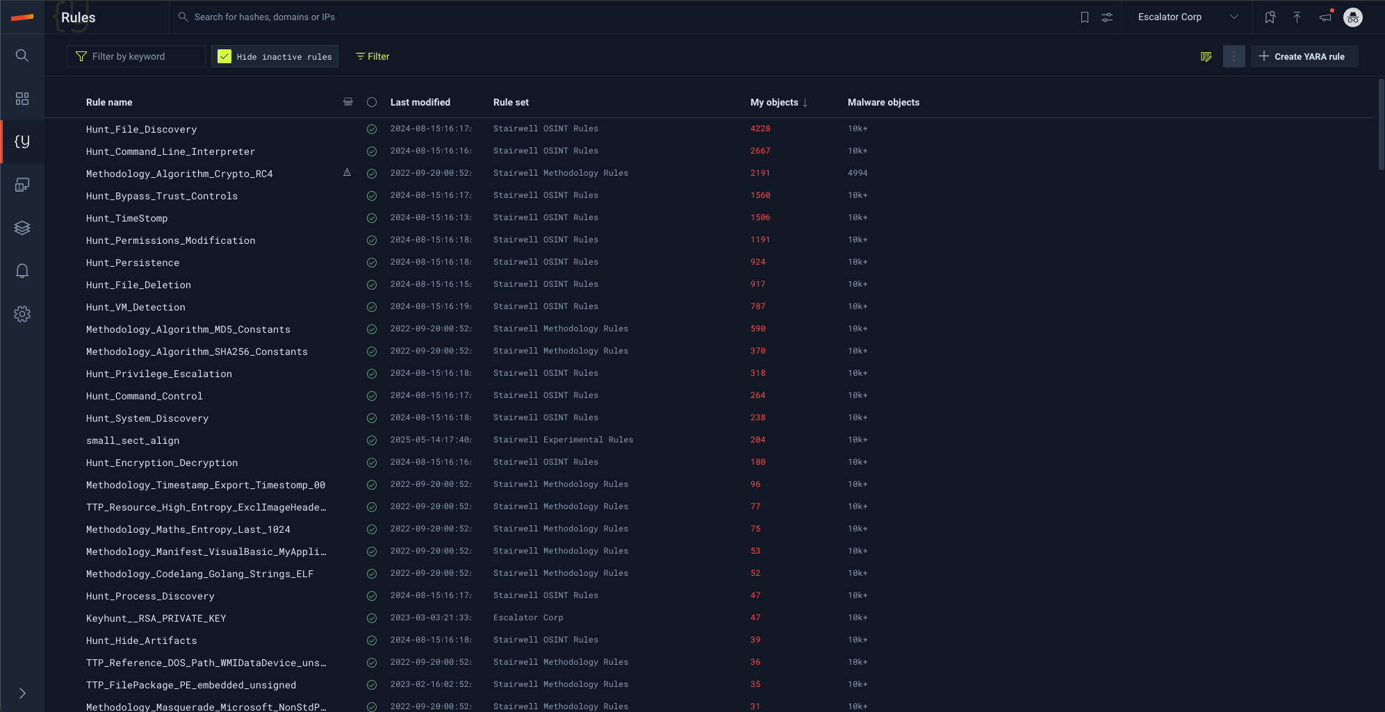 Finding a specific Yara rule is relatively easy using varying degrees of specificity. One of the most important factors especially for custom Yara rules, is to use a consistent and intuitive naming convention.