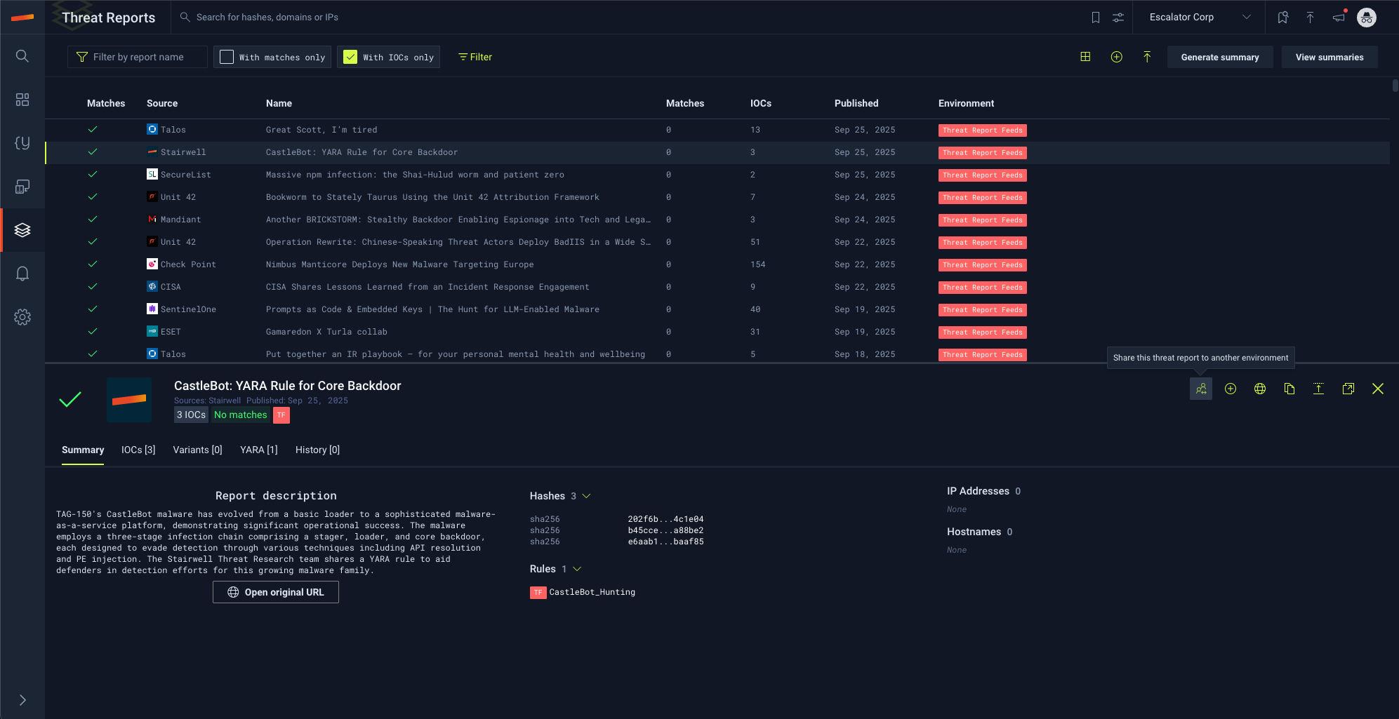Sharing threat reports can allow customers to store and share IOCs such as hashes, ip address, hostnames, and more to run against all objects collected and uploaded into other environments.