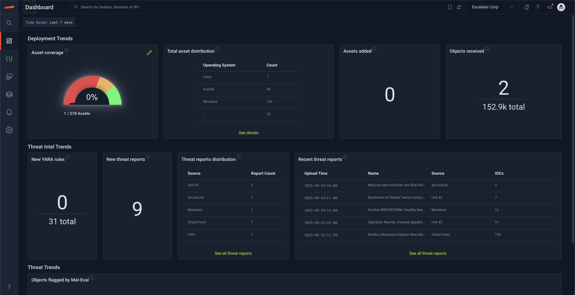 The dashboard is a quick stop to review health and state of assets, objects, rules, reports, and more.