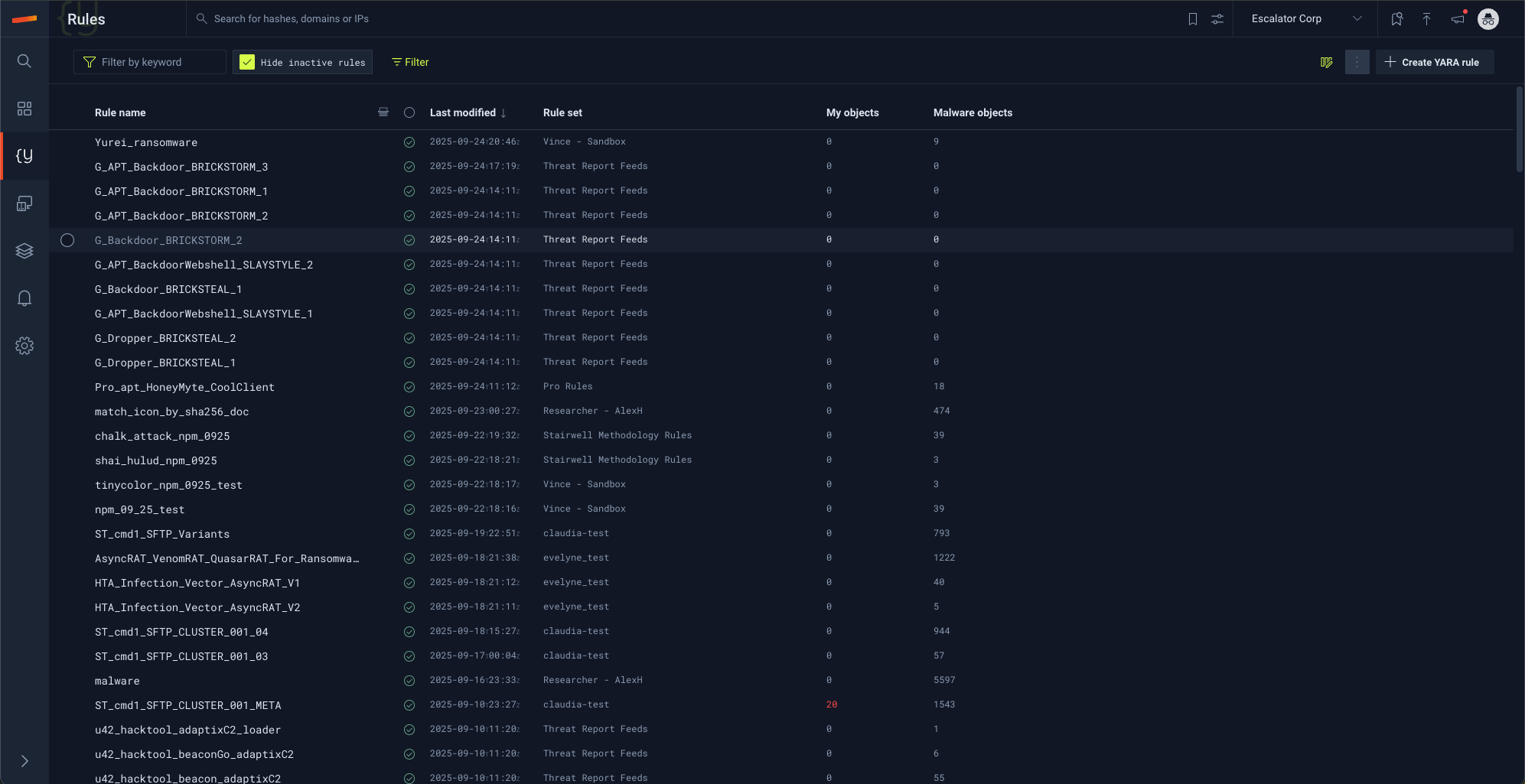 The YARA rules section is a powerful section that allows users to review, create, modify, and delete rules. From here users can also click into rules and results to pivot into interesting matches.