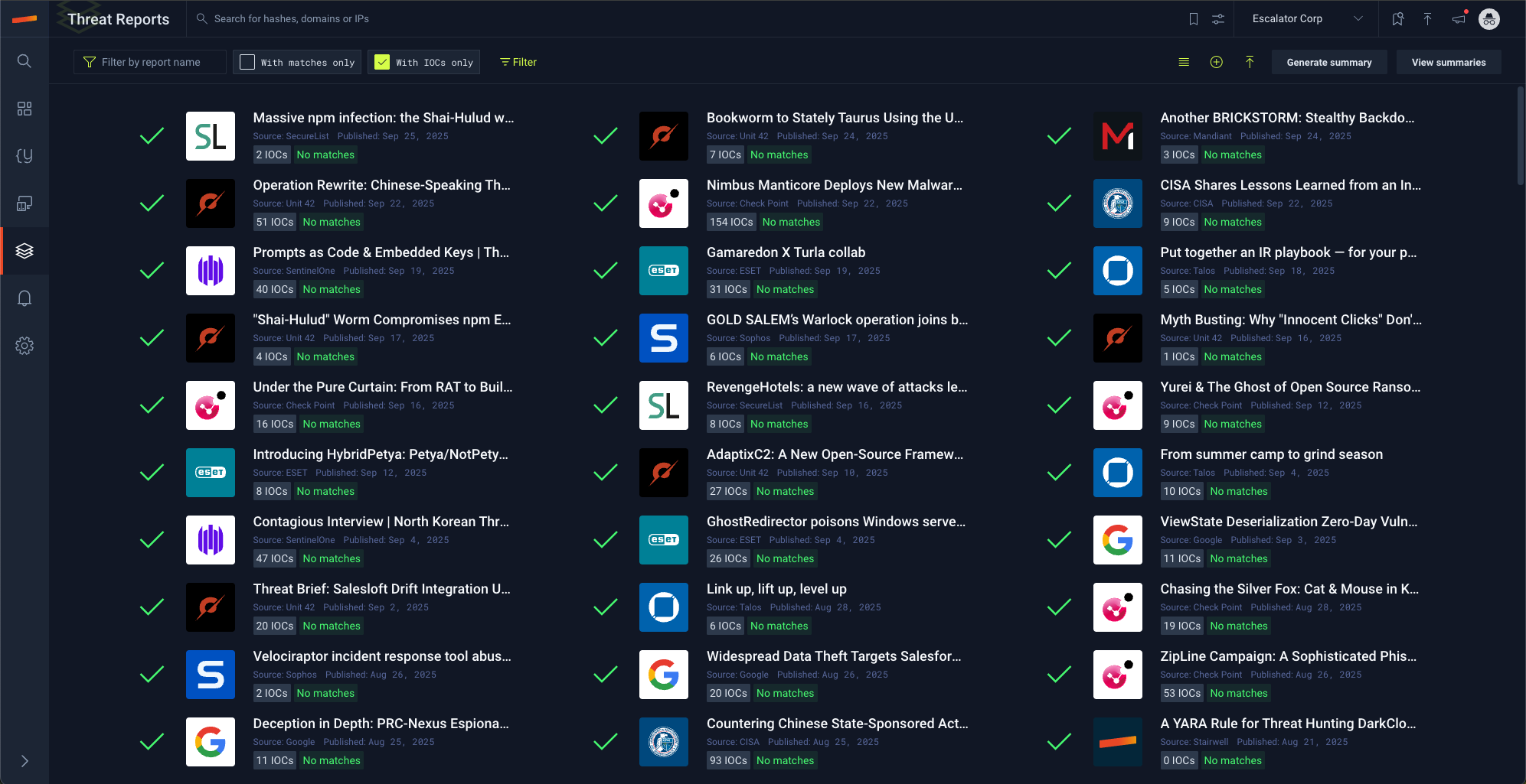 In the threat reports section of the Stairwell UI, you'll see all the threat reports that Stairwell or your team has identified, uploaded, parsed, and ran against your data. This is a quick and easy way to see if any published indicators of compromise are seen in your environment(s), and if so, where and when.