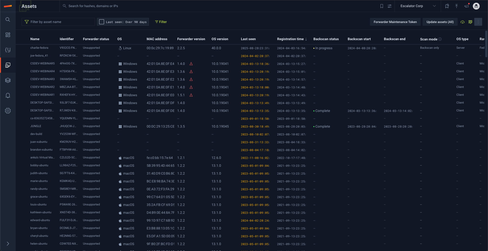The assets screen is designed to display the status and condition of assets. It not only provides details about the assets, including names, identifiers, operating systems, and more, but also offers insights into the scanning and uploading status of the forwarder. From this screen, users can upgrade forwarder versions, organize assets into groups, implement and tailor forwarder policies, establish exclusions and filters, and ultimately, delve into notable objects observed on the assets.