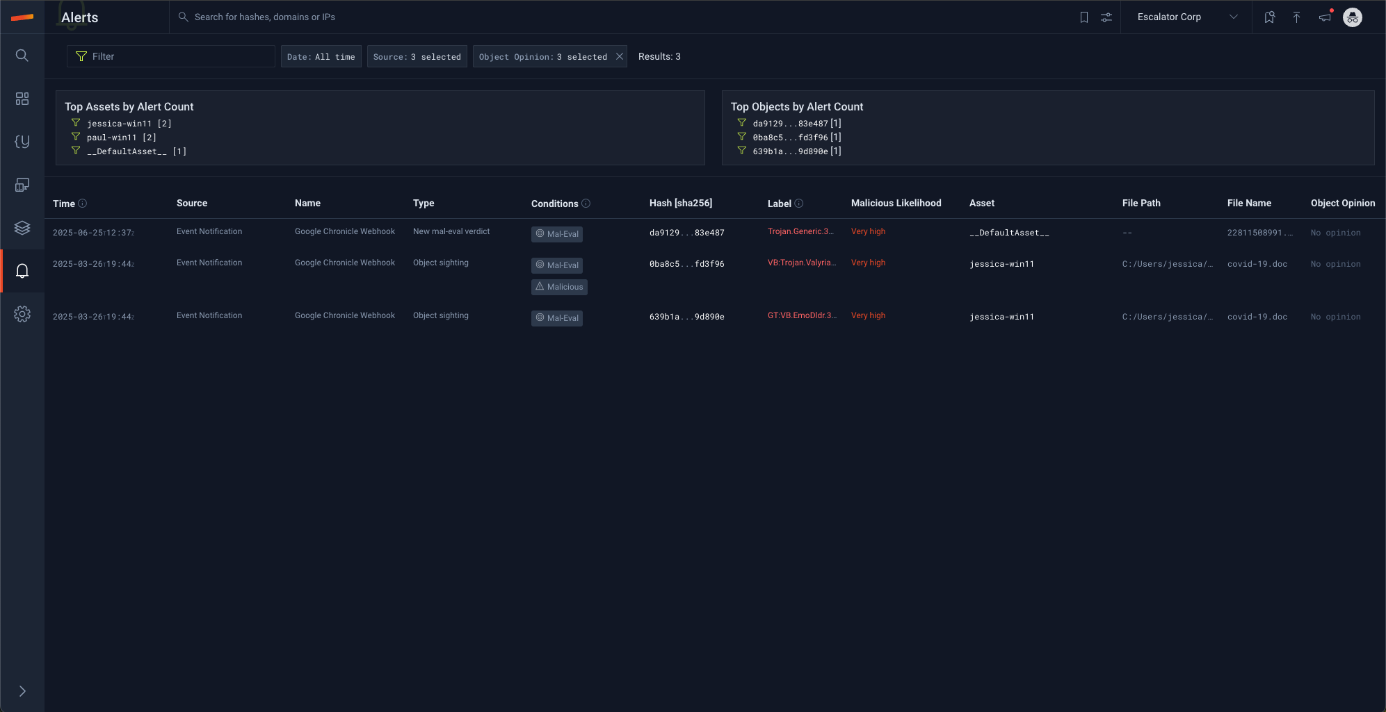 In the alerts section of the Stairwell UI, you'll be able to see the items configured as conditions in event notifications as well as some of the items Stairwell marks for escalation through MalEval.
