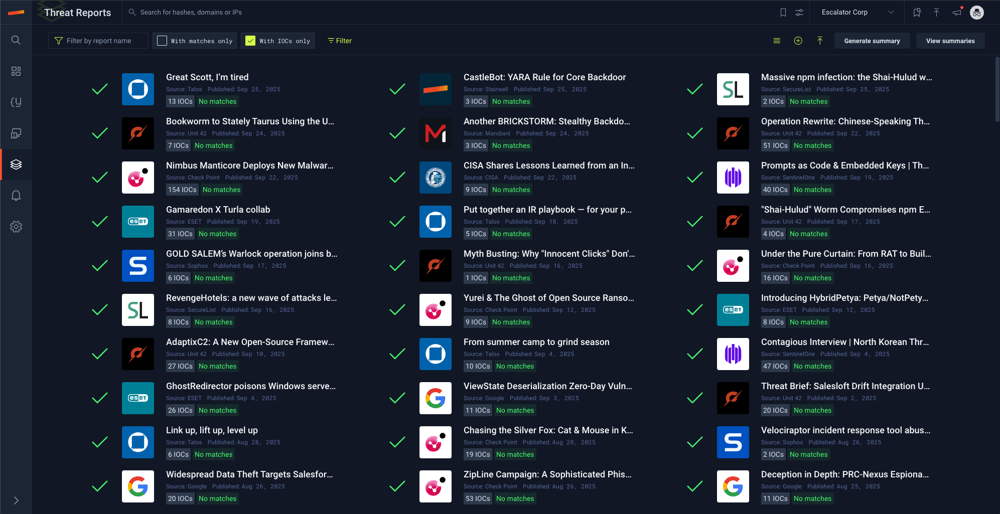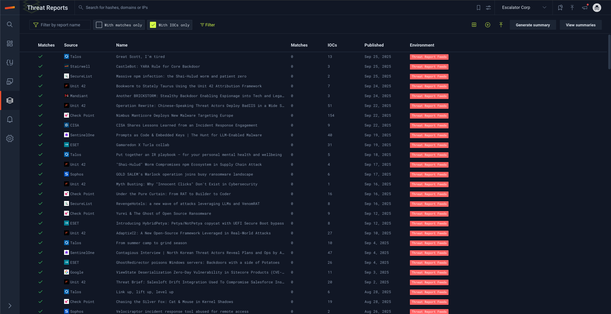 Viewing existing threat reports can allow customers to investigate IOCs such as hashes, ip address, hostnames, and more that are run against all objects collected and uploaded into the customer's private Stairwell data lake.